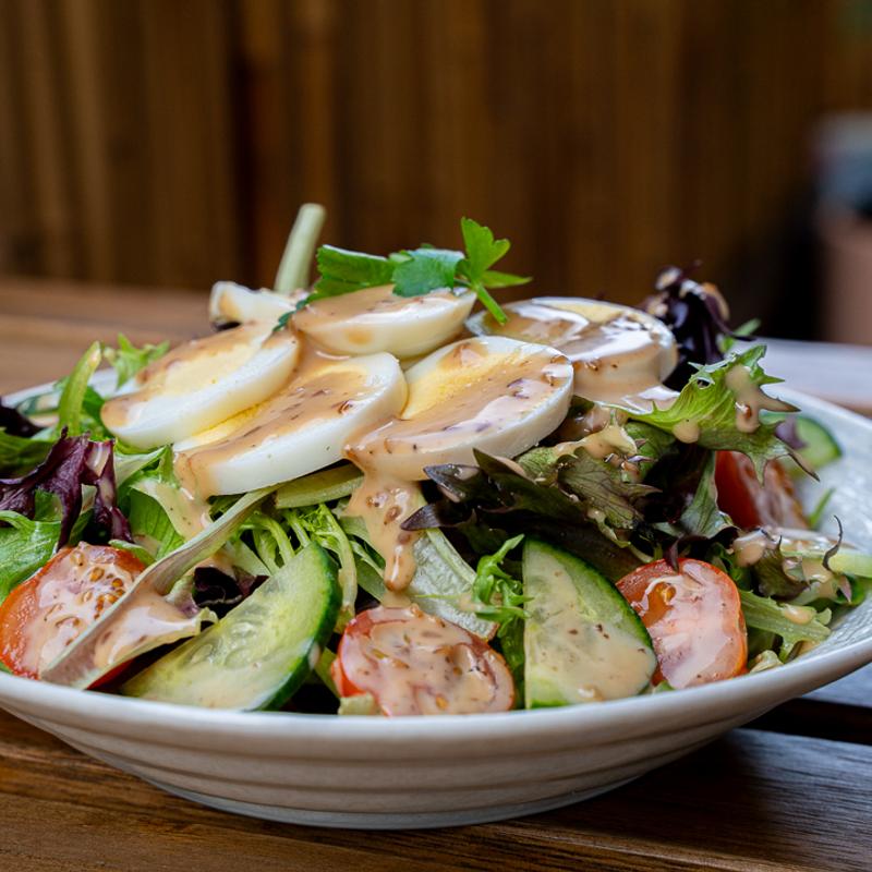 Spring mix topped with cherry tomatoes, cucumbers, and sliced hard boiled eggs. Your choice of sesame dressing or ranch | Add Chicken +$2.00 | Shrimp +$3.00